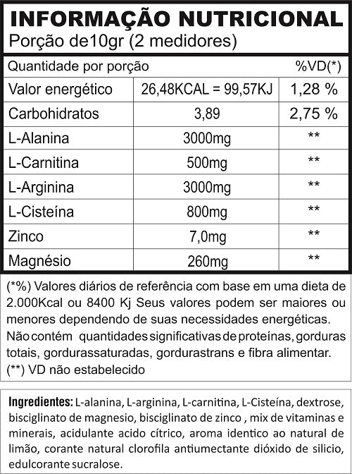 Ingredientes: L-alanina, L-Arginina, L-Carnitina, L- Cisteína, Dextrose, Bisciglinato de Magnésio, Bisciglinato de Zinco, Mix de Vitaminas e Minerais, Acidulante acido Cítrico, Aroma Idêntico ao Natural de Limão, Corante Natural Clorofila Antiumectante, Dióxido de Silico, Edulcorante Sucralose.